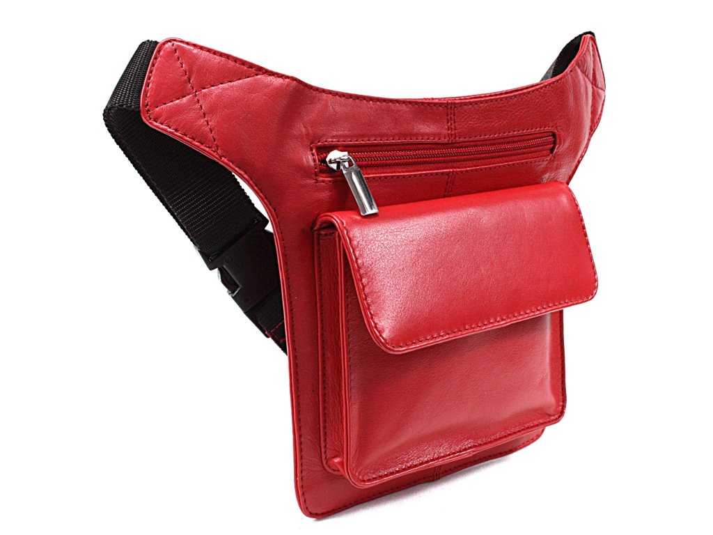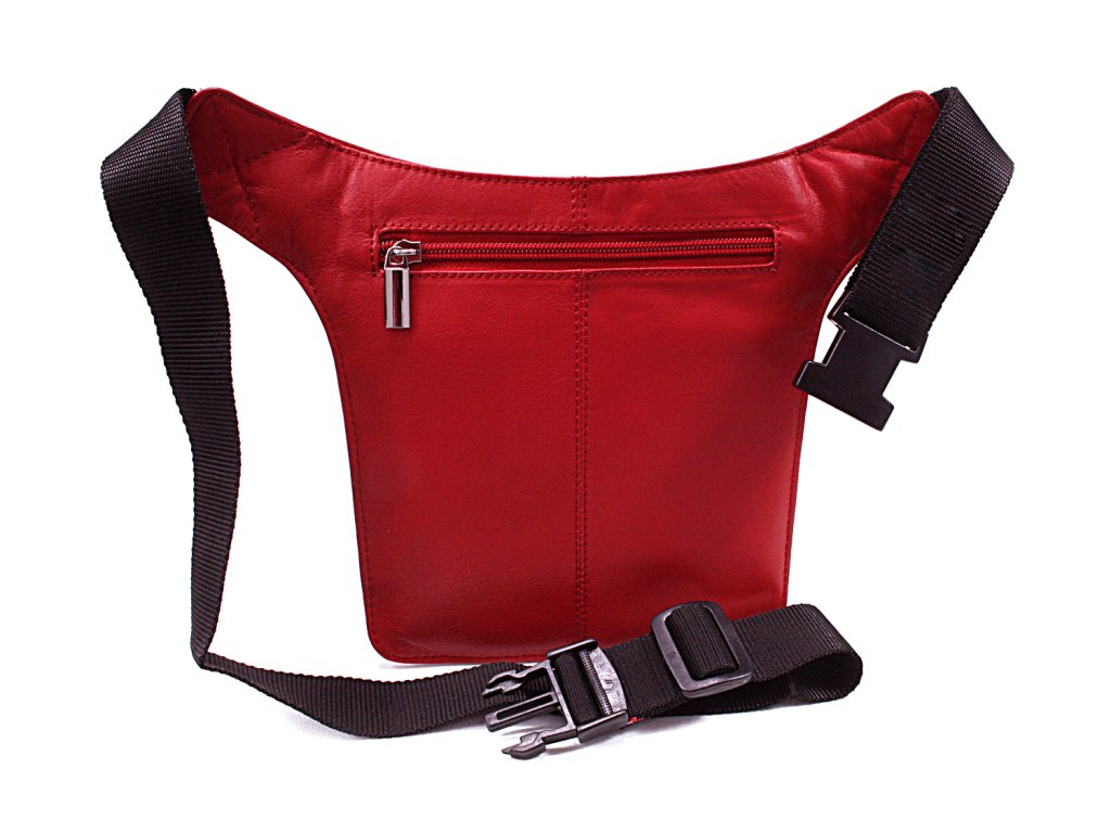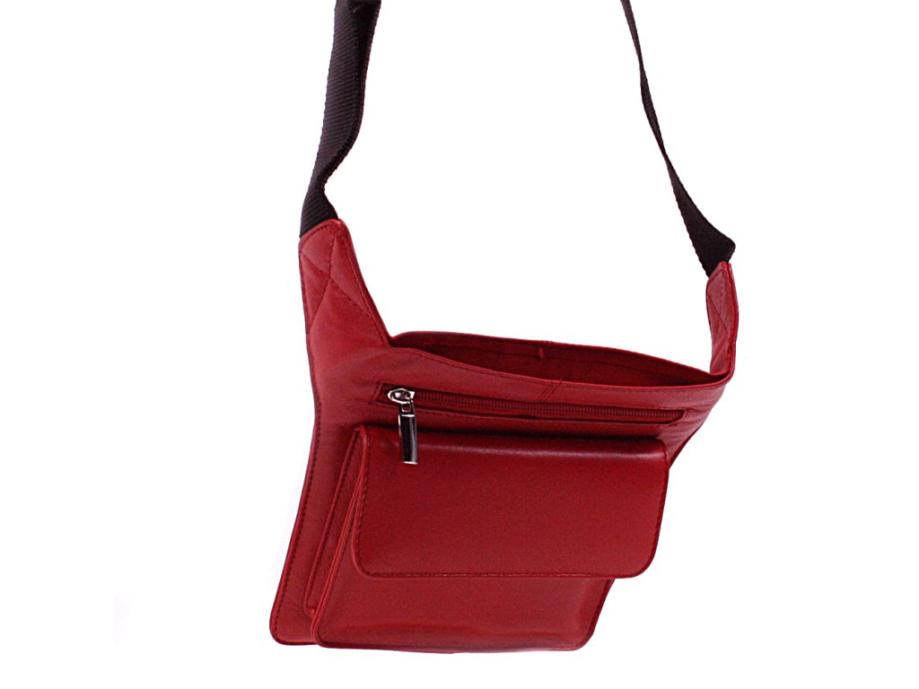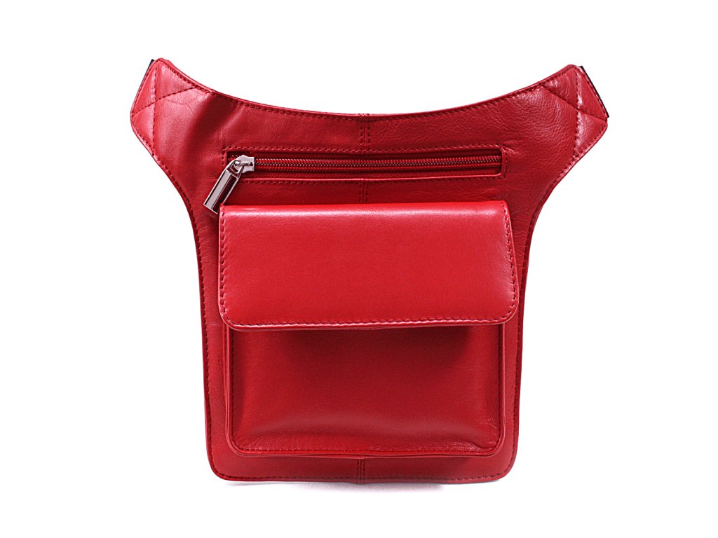 Moderná ľadvinka má netradičný štvorcový tvar a 1 hlavnú kapsu uzatvárateľnú na suchý zips. Na prednej strane je zipsová kapsa a menšia klopová kapsička. Na zadnej strane je skrytá zipsová kapsa. Zipsy sú v červenej farbe so strieborným kovaním. Šitie je červené. Popruh v čiernej farbe je nastaviteľný do cca 85 cm, celková dĺžka aj s ľadvinkou je cca 115 cm. Možnosť nosenia okolo pásu alebo cez rameno.
