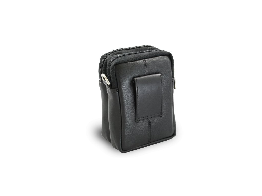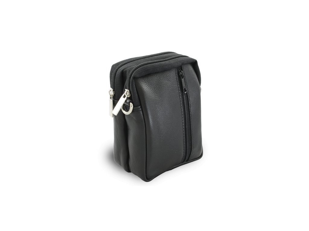 Menšie kožené etue na doklady pre cestovanie a turistiku, 2 veľké zipsové kapsy a malá predná kapsička, na zadnej strane pútko na opasok, súčasťou je odnímateľný a nastaviteľný kožený popruh v max dĺžke 140 cm s karabínkami.