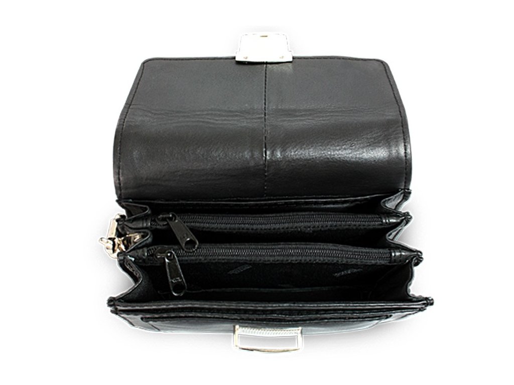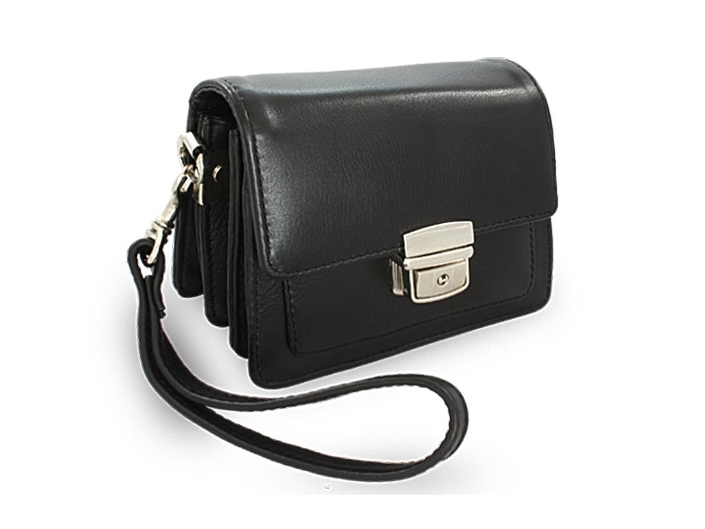 Menšie elegantné kožené pánske praktické etue obsahuje 3 hlavné priehradky rozdelené zipsovými kapsami. Pod klopou sa nachádza otvorená kapsa. Súčasťou etue je odnímateľné pútko na zápästie. Farba kovania je strieborná.