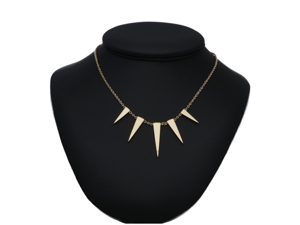 Krásny dámsky náhrdelník o veľkosti 50 -56 cm s ostňami o veľkosti 1,4 x 0,5 cm. Tento náhrdelník z chirurgickej ocele v jemne zlatej farbe zvýrazní každý každodenný outfit, no vynikne aj pri spoločenských akciách.