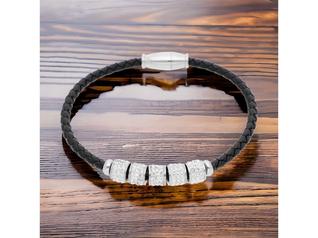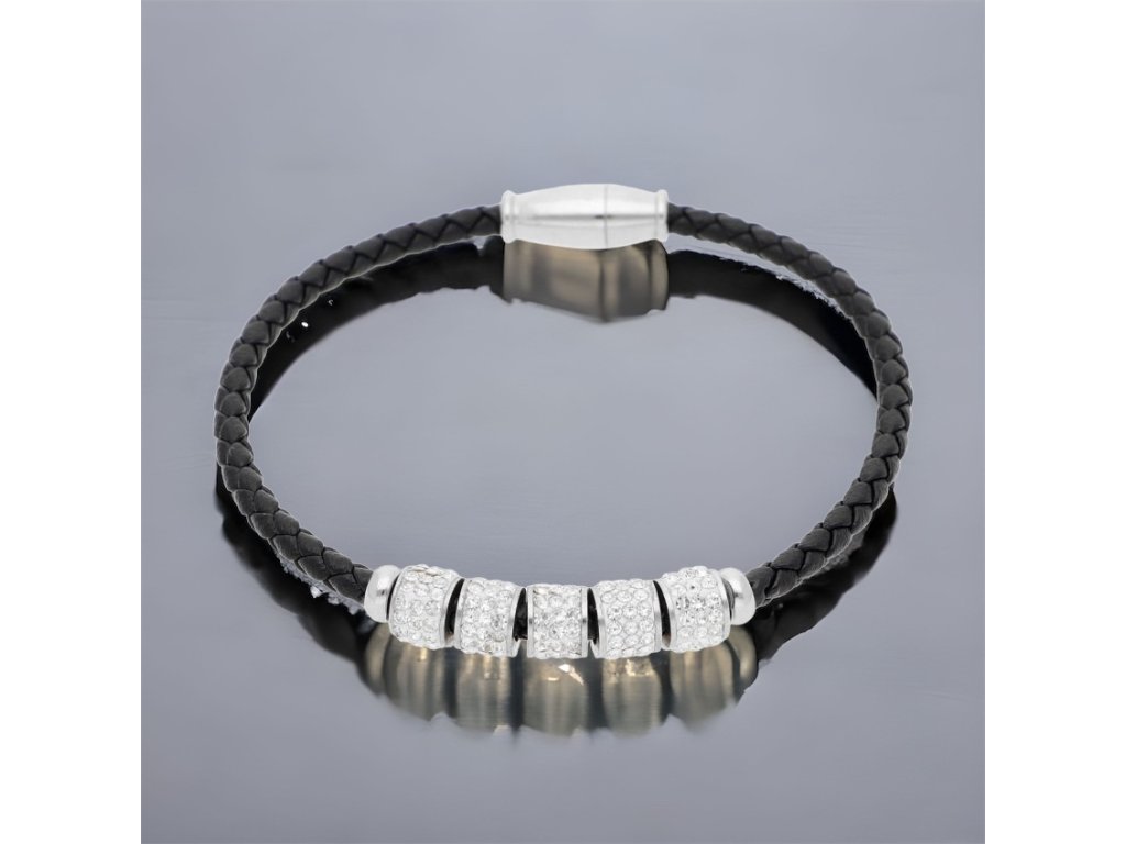 Obvod náramku 19,5 cm, priemer valčeka 7 mm, váha 5g. Magnetické zapínanie. Materiál: chirurgická oceľ, eco koža, zirkóny.