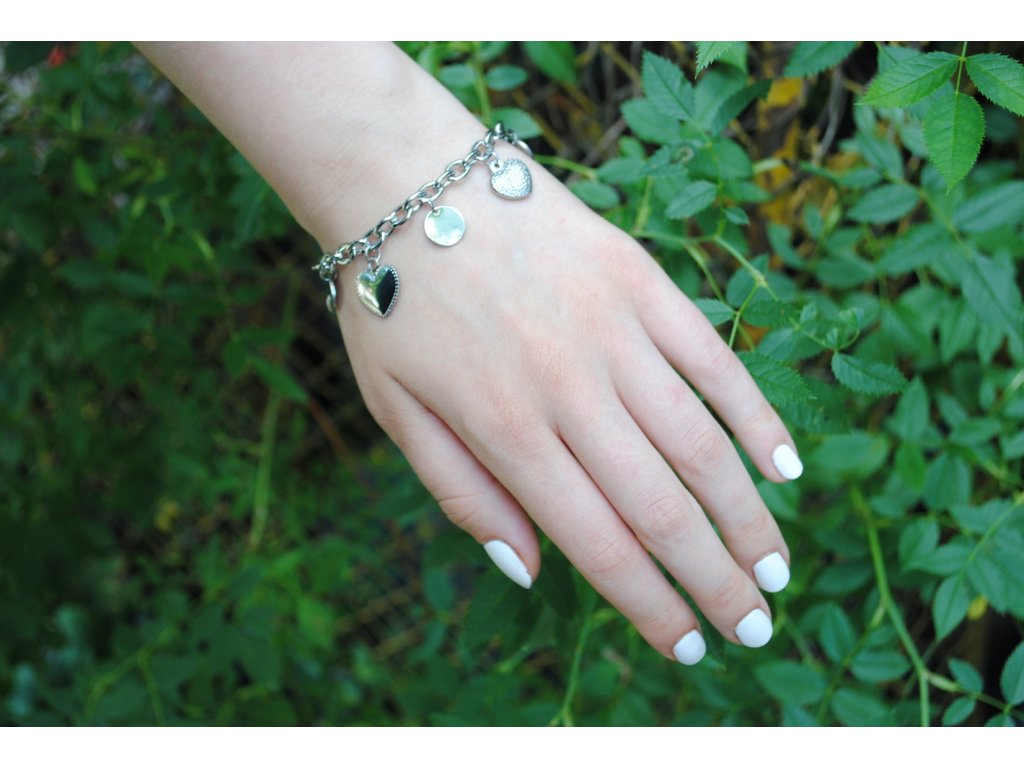 Rozmery: obvod náramku 21 cm, náramok je možné zapnúť na hociktoré očko, čím padne aj na menšie zápästie. Veľkosť srdiečok 1,3 cm.