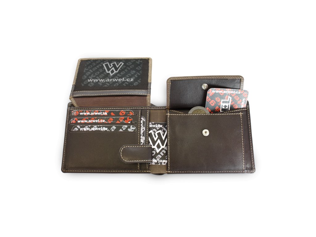 2 priehradky na bankovky, klopová kapsa na mince, 9 kapsí na kreditné karty, občiansky alebo vodičský preukaz, veľká priehľadná.