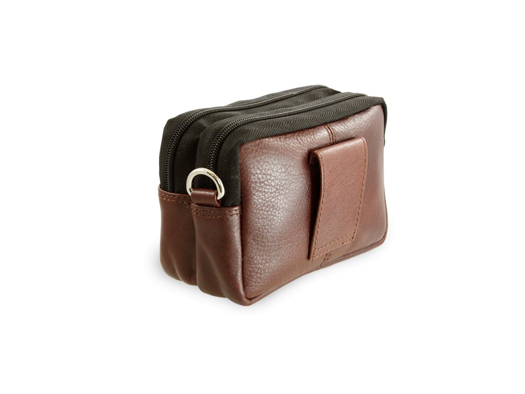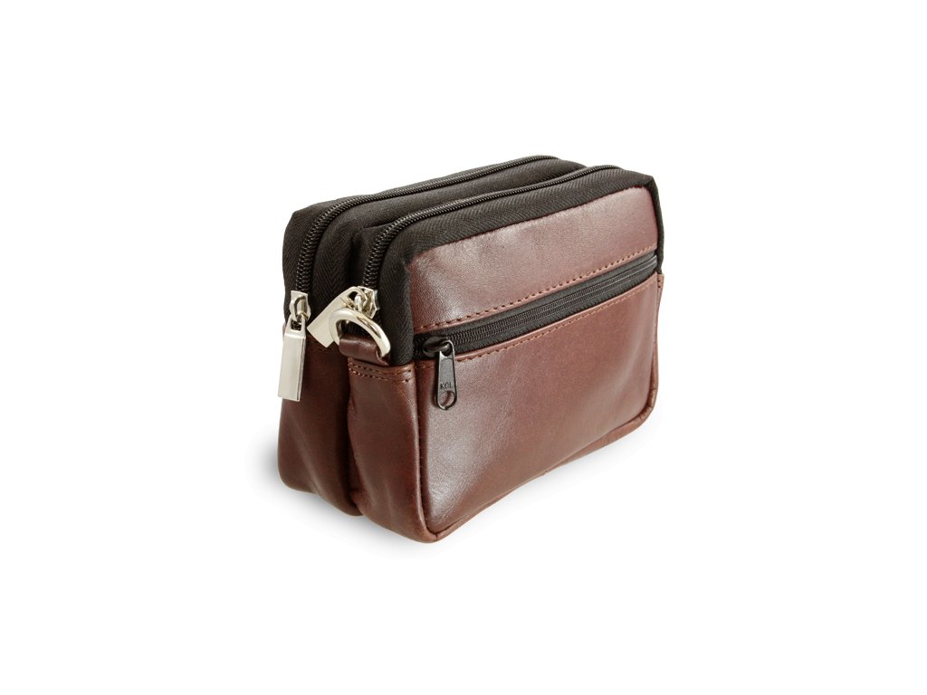 2 veľké zipsové kapsy a malá predná kapsička, na zadnej strane je pútko na opasok, súčasťou je odnímateľný a nastaviteľný kožený popruh v max dĺžke 140 cm s karabínkami.