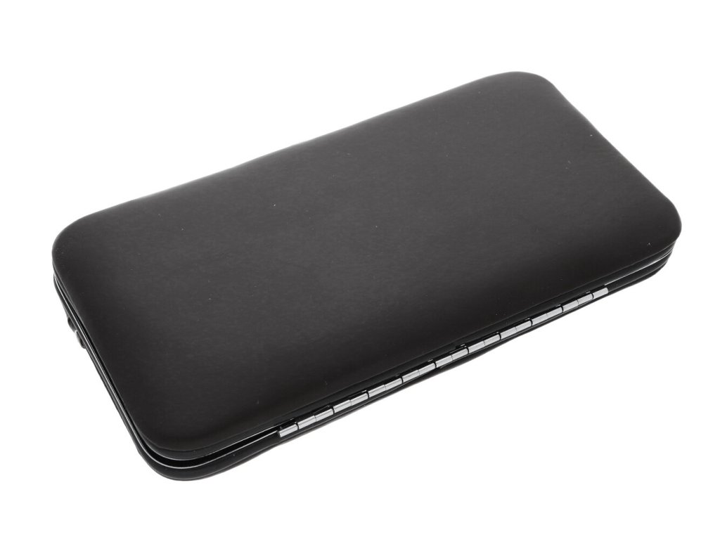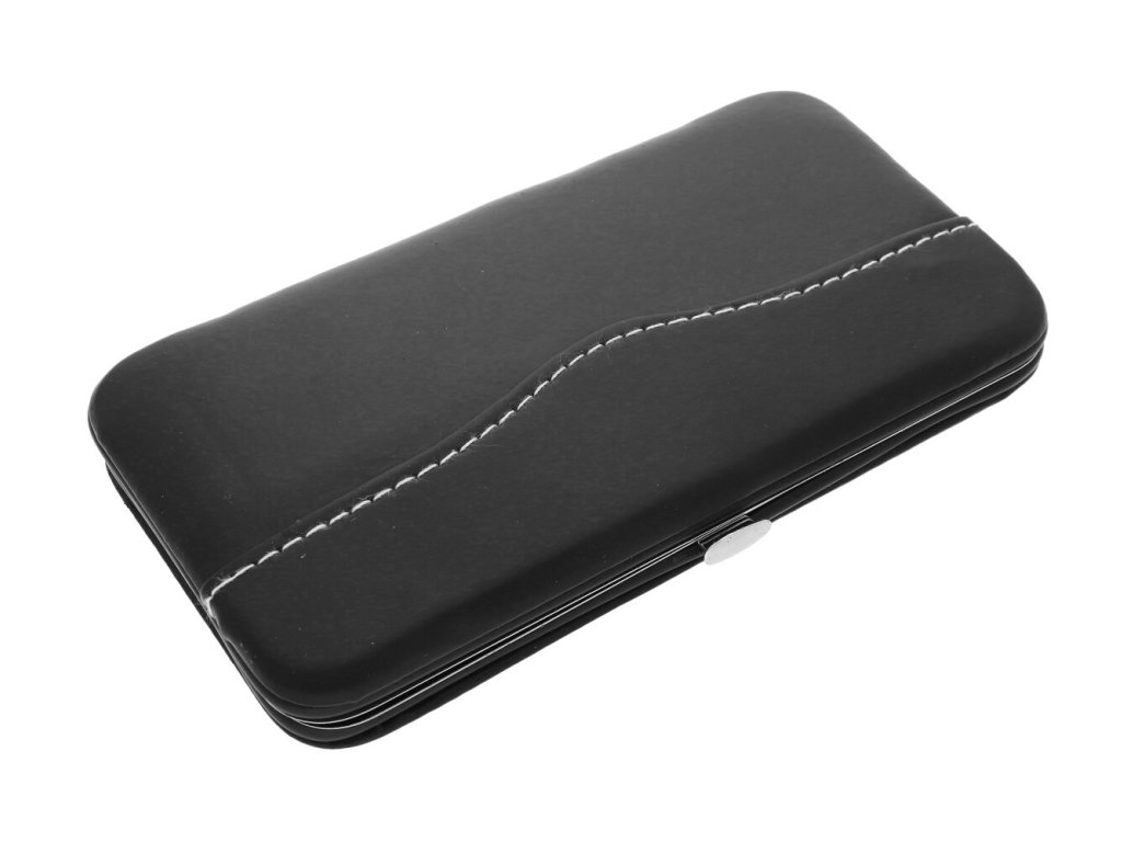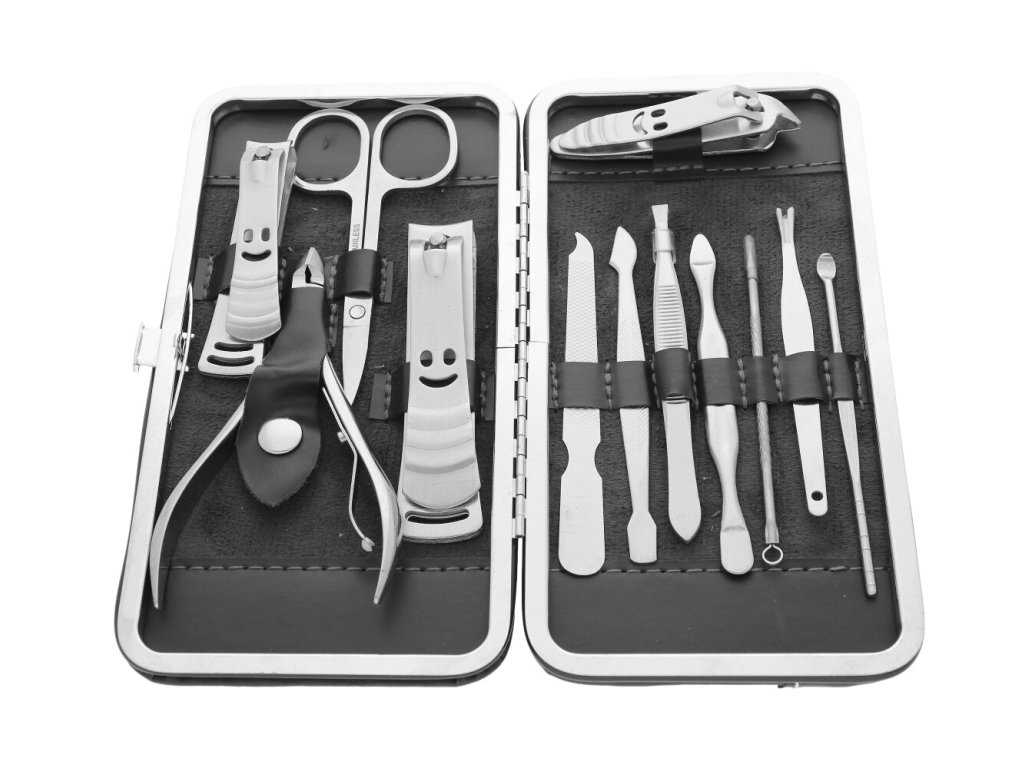 Manikúra z nerezovej ocele obsahuje nožničky na nechty, 3ks klieštikov, pinzetu, odstraňovač kožičky a pilník, manikúrne nástroje na zatlačovanie kožičky/čistenie nechtov, nožničky na nechtovú kožičku. Rozmery manikúry 85 x 160mm. Obal manikúry: umelá koža čierna.
