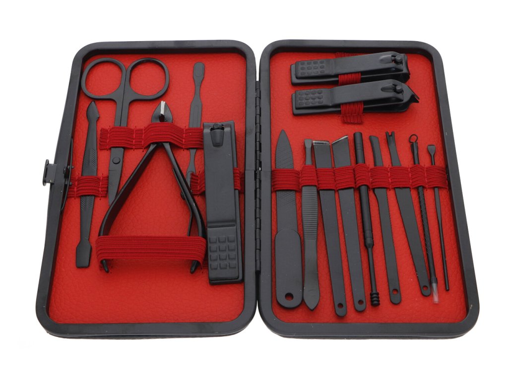 Manikúra obsahuje nožničky, 3 ks klieštikov, pinzetu, pilník, rôzne nástroje na úpravu kožičky/čistenie nechtov.