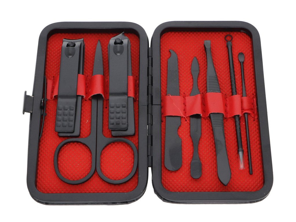Manikúra obsahuje nožničky, 2 ks klieštikov, pinzetu, pilník, rôzne nástroje na úpravu kožičky.