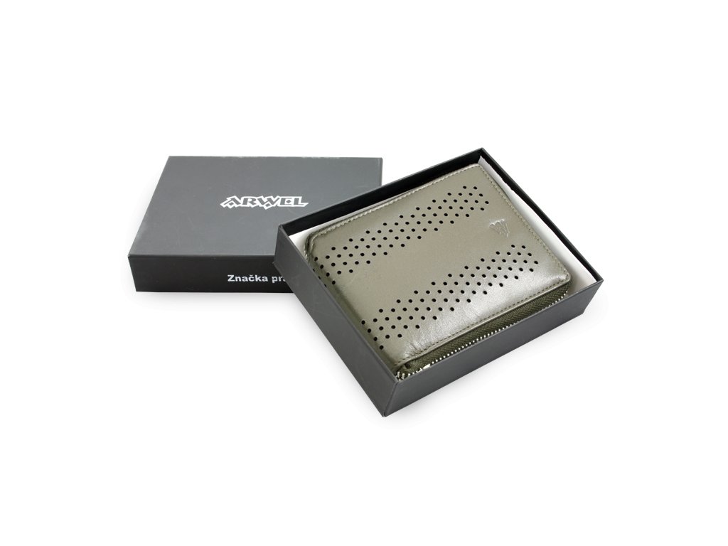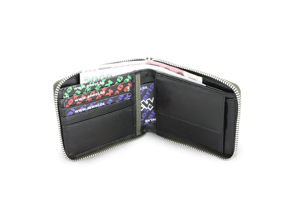 2 priehradky na bankovky, klopová kapsa na mince, 7 kapsí na kreditné karty, občiansky alebo vodičský preukaz. Kovový zips.