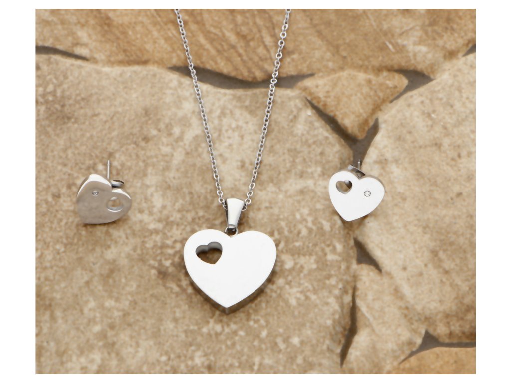 Nádherná súprava retiazky s príveskom v tvare srdiečka a náušníc z leštenej chirurgickej ocele. Krásny a romantický vzhľad hladkej leštenej ocele doplnený o jemnosť vsadeného kamienka.